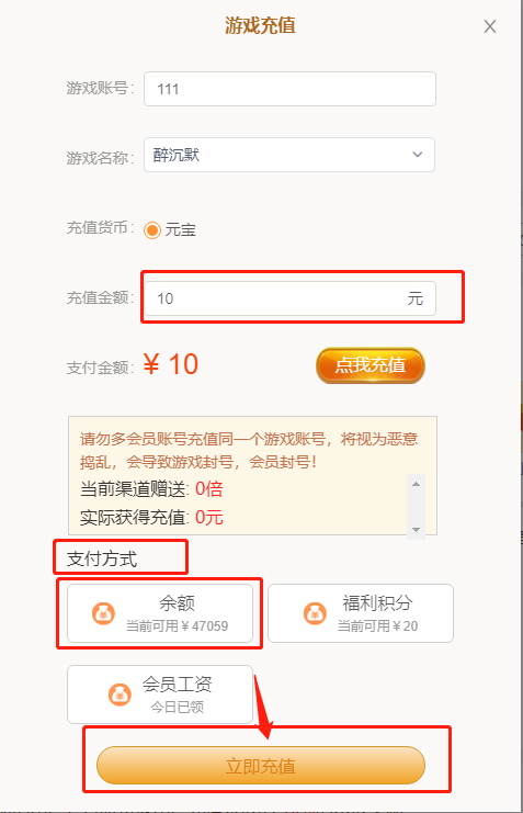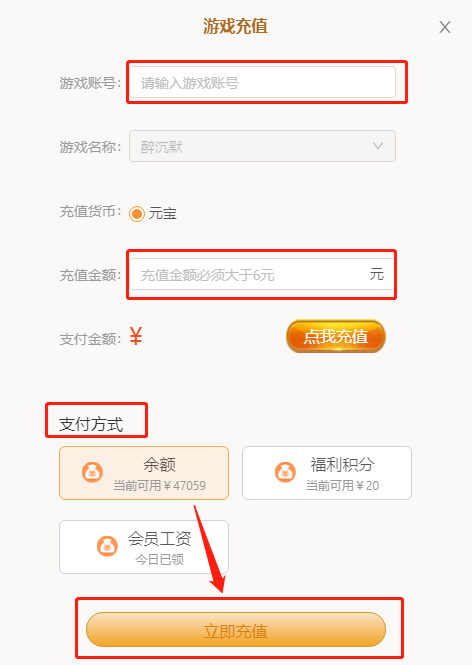 会员余额,福利积分,会员工资均可充值到任意游戏中,点击立即充值